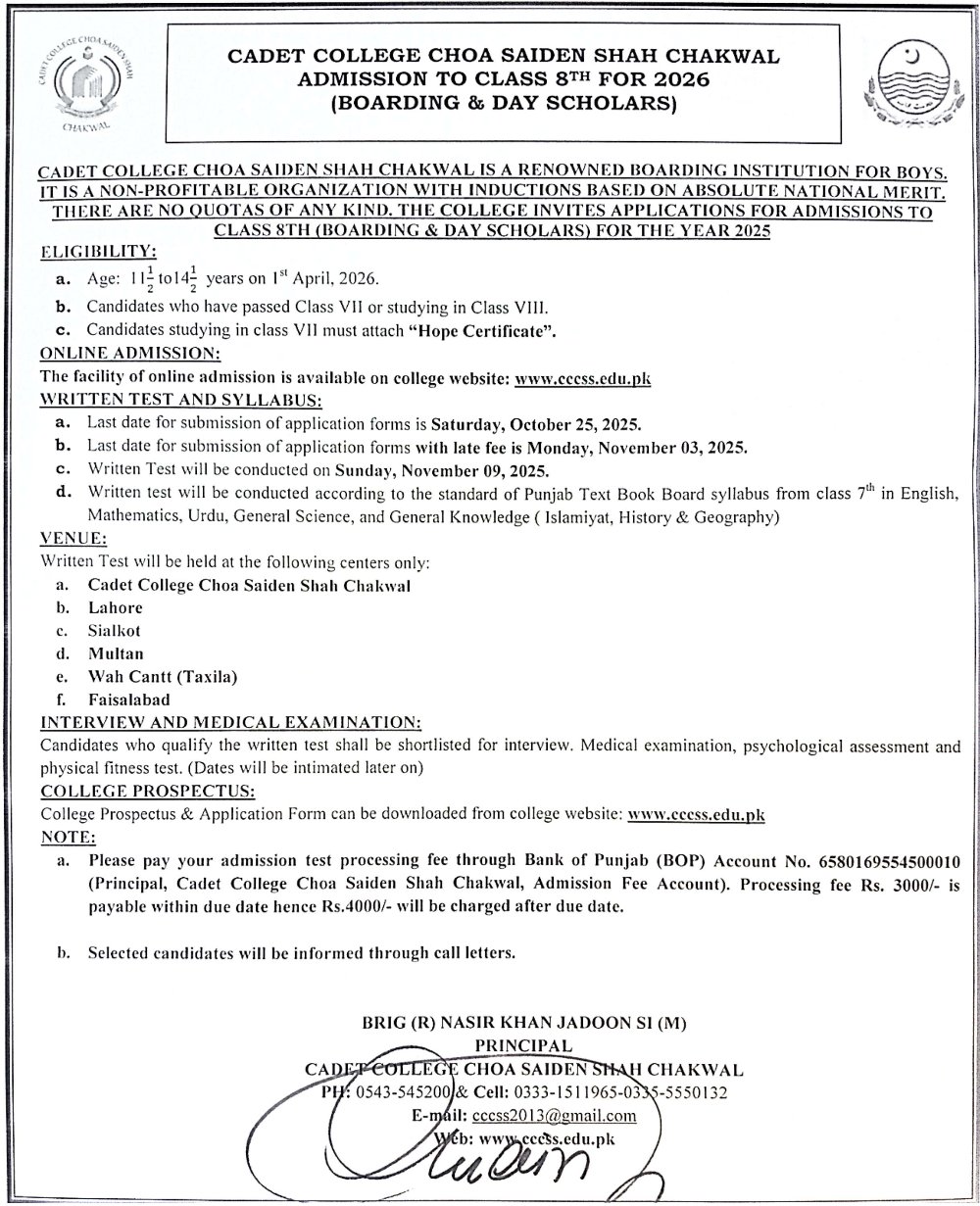 Advertisement for 8th Class (2025-26).