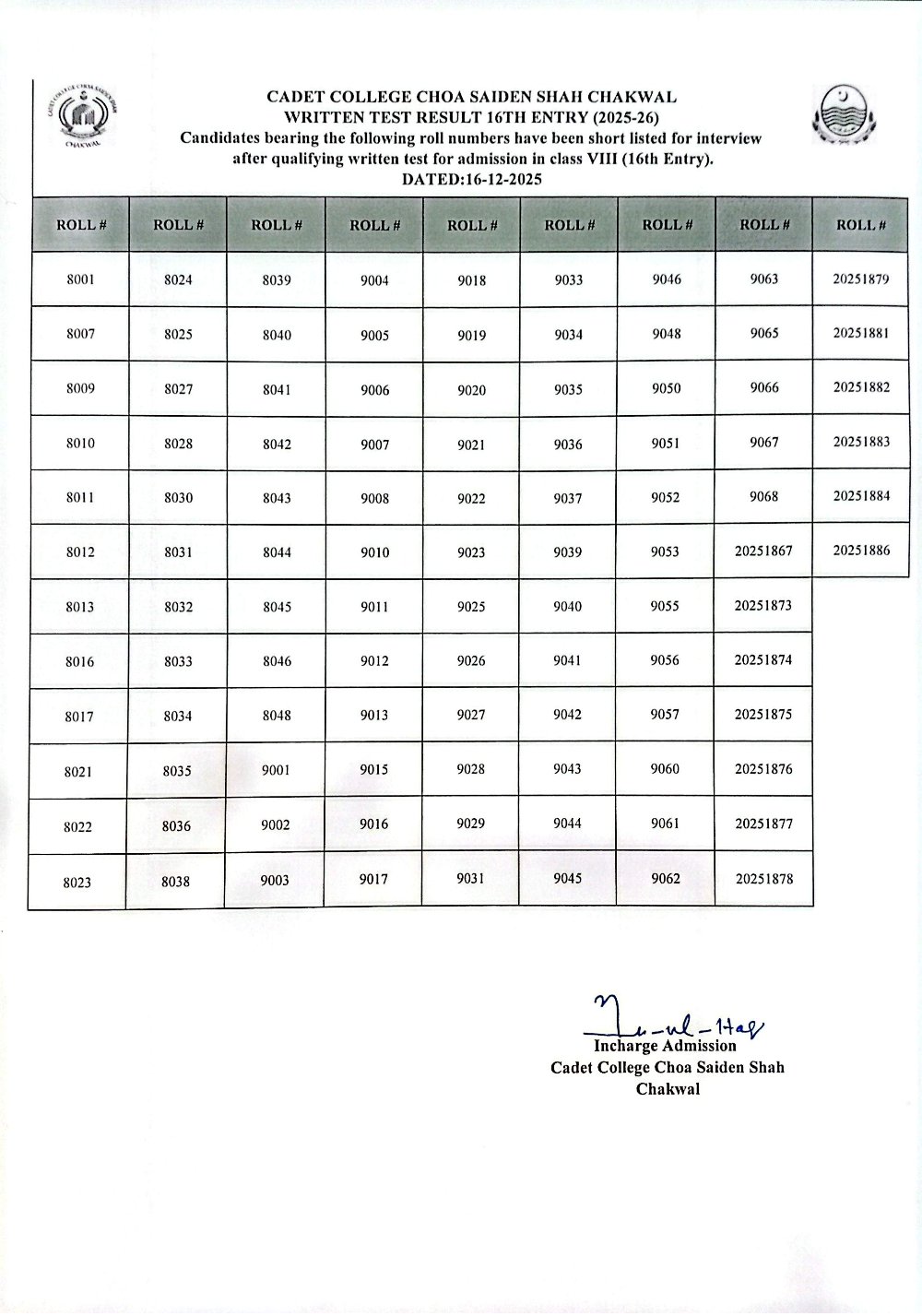 WRITTEN TEST INTERVIEW AND MEDICAL RESULT 16TH ENTRY (2025-26)